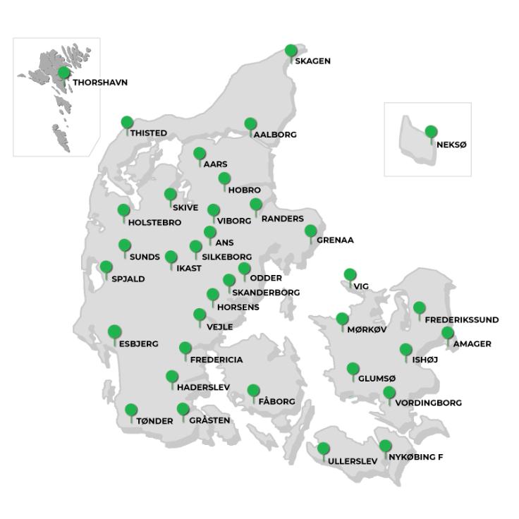 36 butikker over hele landet