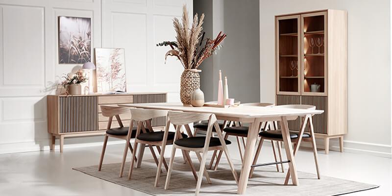 Du kan fuldende udtrykket i spisestuen med nogle elegante spisebordsstole i træ fra Skovby og en smuk skænk fra Rimme i hvidolieret eg eller olieret valnød og en elegant vitrine fra Rimme i hvidpigmenteret eg med glas.