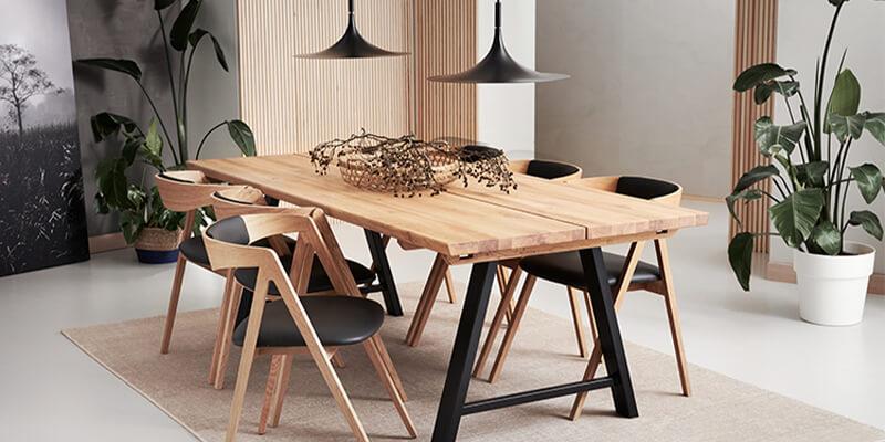 Hvis du gerne vil have et elegant og roligt udtryk, bør du nok holde dig til maksimalt at blande et par forskellige træsorter. Er du mere modig, siger vi “go for it”. Det kan faktisk give et rigtig spændende og unikt udtryk, hvis du eksempelvis har flere forskellige slags stole rundt om spisebordet.